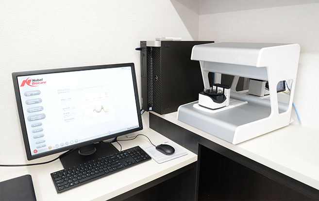 3Dで立体的に撮影するためのスキャナー(画面左)で患部を撮影し、被せ物や詰め物などの修復物を設計します。設計図を元にミリングマシン(画面右)で修復物を削り出していきます。